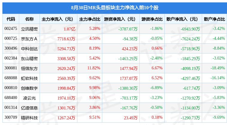 从资金流向上来看,当日MR头显板块主力资金净流入2.34亿元,游资资金净流出3216.37万元,散户资金净流出2.02亿元。MR头显板块个股资金流向见下表: