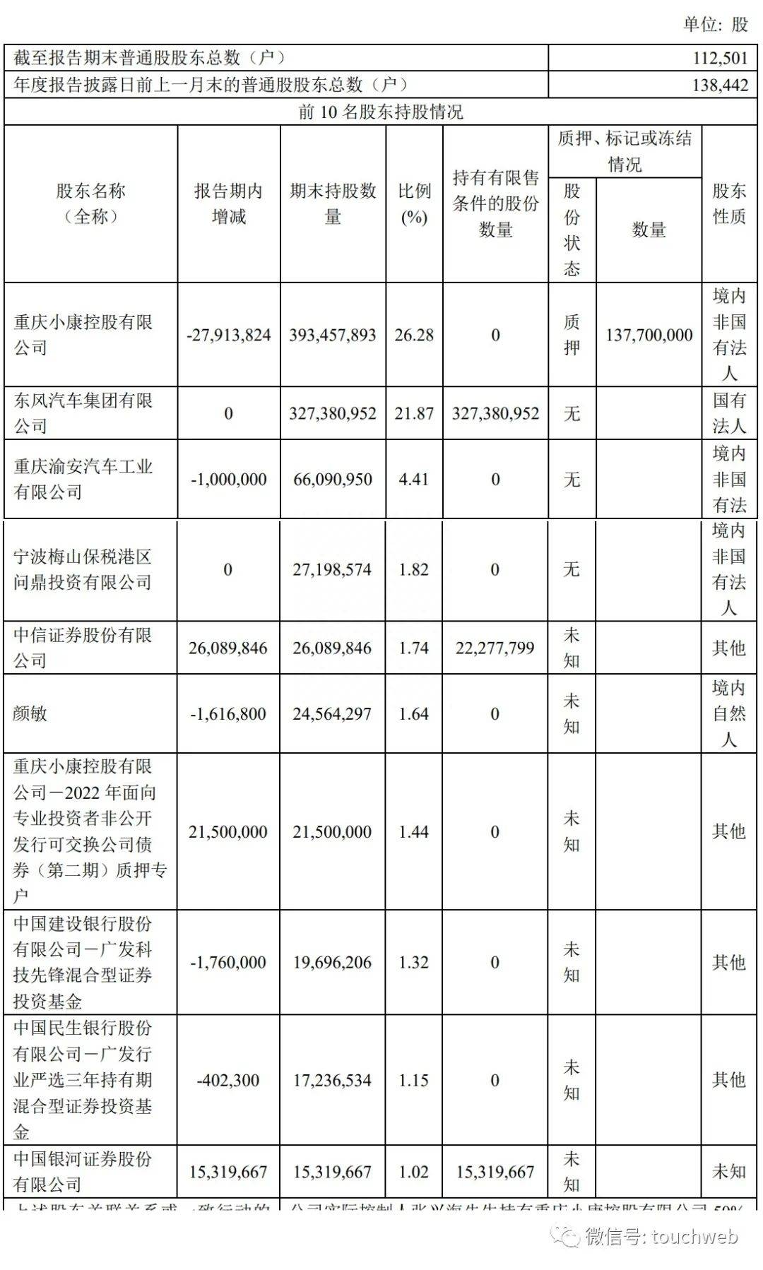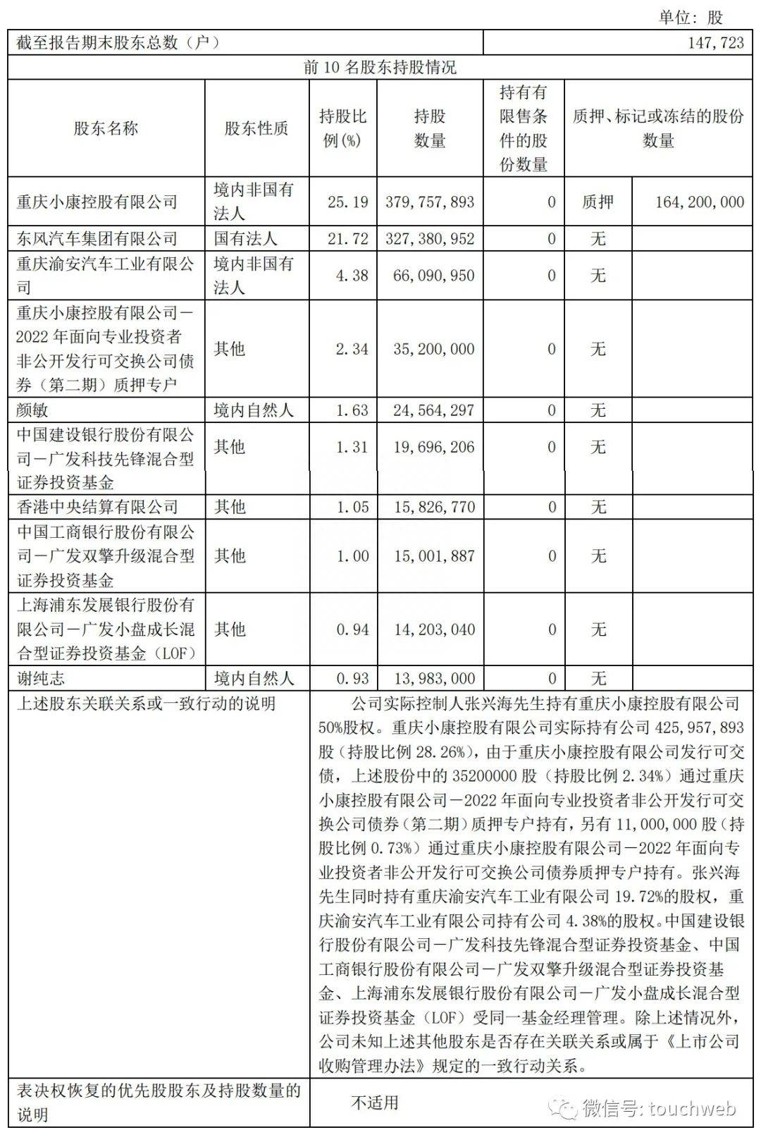 截至2023年6月30日,重庆小康控股有限公司(简称“小康控股”)持股25.19%,东风汽车公司持股21.72%,重庆渝安汽车工业有限公司(简称“渝安工业”)持股4.38%,重庆小康控股有限公司-2022 年面向专业投资者非公开发行可交换公司债券(第二期)质押专户持股为2.34%;