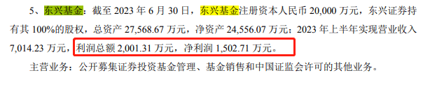 根据半年报东兴基金部分数据显示,截至2023年6月30日,东兴基金注册资本人民币2亿元,东兴证券持有其100%的股权,总资产2.76亿元,净资产2.46亿元;2023年上半年实现营业收入7014.23万元,利润总额2001.31万元,净利润1502.71万元。值得注意的是,去年同期东兴基金净利润仅有203.62万元,同比增幅高达636.6%。营收较去年同期增长也较大,为49.32%。