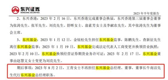 除对业绩的披露外,东兴证券发布的中期报告还披露了报告期内东兴基金的重大事项。其中,2023年8月2日,王青不再担任东兴基金总经理、董事,董事长牛南洁先生代行东兴基金总经理职务。