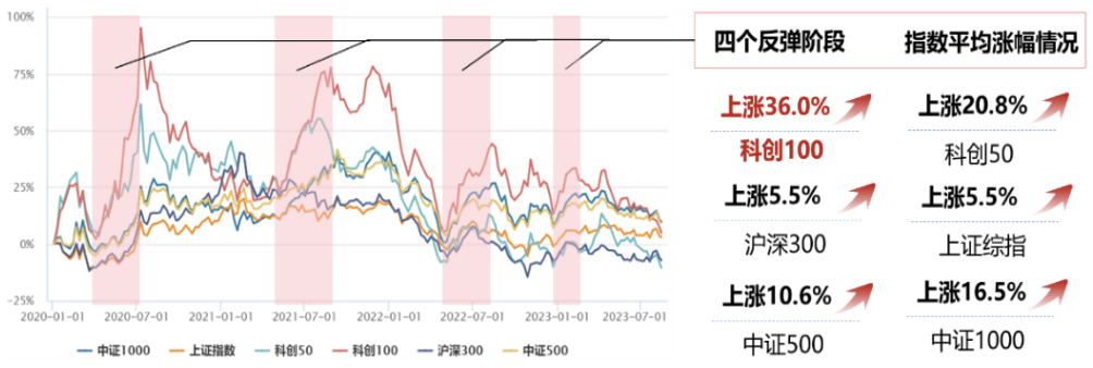两个指数的弹性差异确实还是很大的。我们之前统计过基日(两个指数的基日都是2019/12/31)以来的表现,其实也就是2020年到现在,这个时间段历史上有四次比较像样的大的反弹。这四个反弹阶段我们计算了一下,科创板100指数的平均涨幅是36%,科创50指数的平均涨幅接近21%。也就是说,四轮下来平均每一轮科创板100要比科创50多涨15%。当然,反过来,当它下跌的时候,科创板100的回撤肯定也是相对更大的。