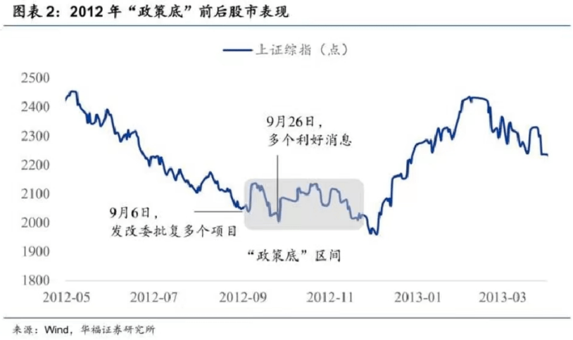 第二个,我想聊一聊政策底到市场底的距离。最近我们看到华福证券研究所有一个数据,三张图的合集放在一起,我觉得非常有意思。他们总结了三轮政策底的往事。