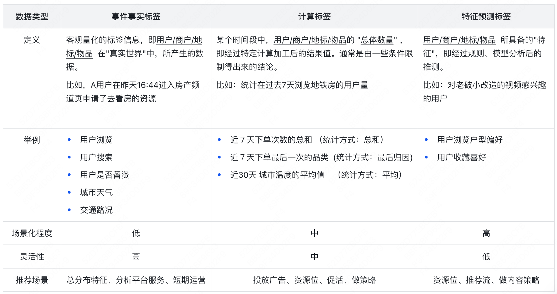 事实行为——客观量化的标签信息,即用户/商户/地标/物品 在“真实世界”中,所产生的数据,比如,A用户在昨天16:44进入房产频道页申请了去看房的资源。在这条记录信息中: