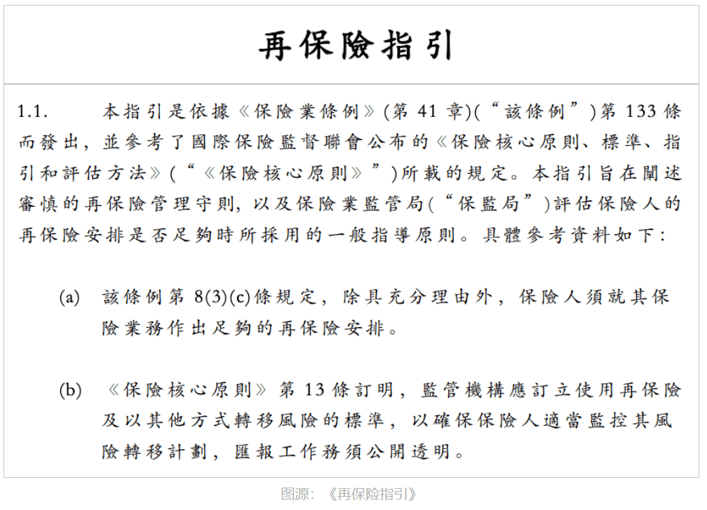 香港《保险业条例》规定,保险公司须为其拟经营的保险类别的风险备有或将会作出足够的再保险安排。香港保监局制定了一份《再保险指引》(指引17)阐述保监局评估保险公司的再保险安排是否足够时所采用的一般指导原则。