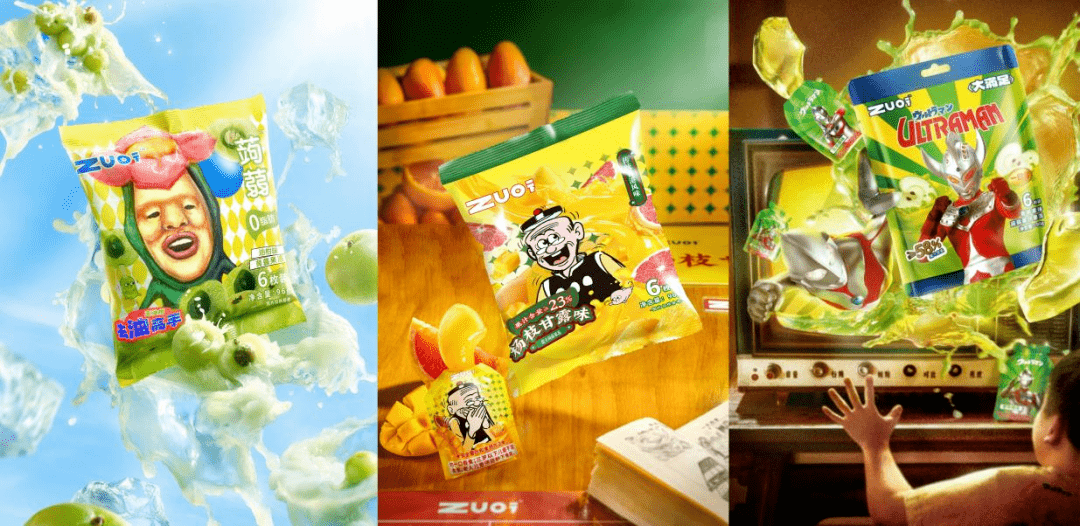 除了屁桃君,ZUO一下还针对细分人群推出的悲伤蛙、汪汪队、奥特曼等众多知名IP联名包装,实现消费圈层拓宽。