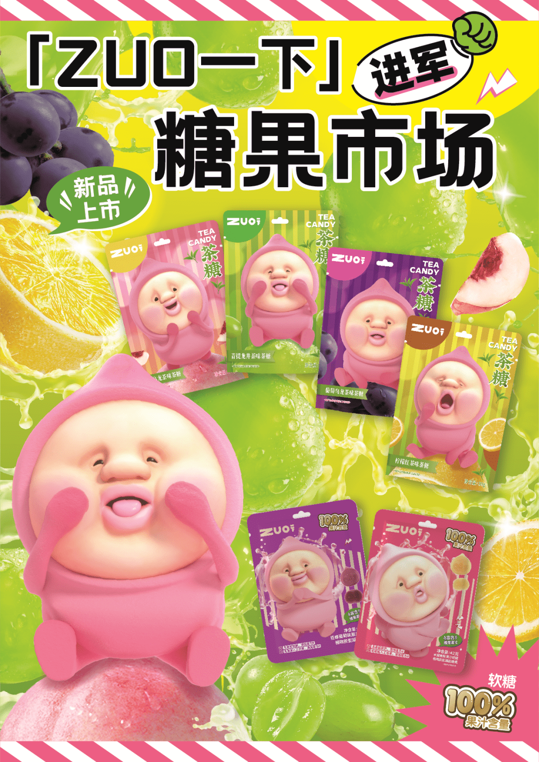 事实上,ZUO一下拥有的不仅是屁桃形象的联名包装权利,作为国内独家总代理,他们还掌握着出版、游戏、玩具等其他再授权业务,从而能够充分发挥此IP的商业价值。前不久,ZUO一下就推出了屁桃潮玩零食新品,更进一步深化屁桃果冻是潮玩零食的消费认知。
