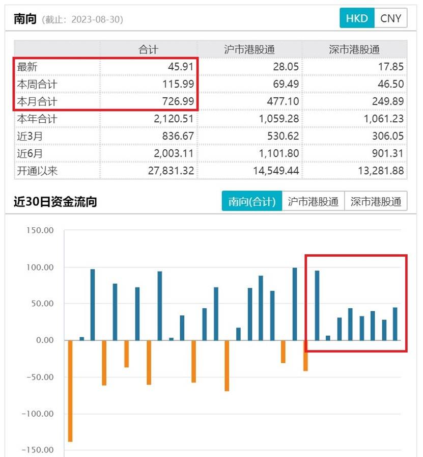 8月以来,北向资金连续净卖出,但南下资金却在持续买入港股。8月30日,南向资金净买入额近46亿元,连续8日净买入,合计超328亿元。8月,南向净买入额已合计近727亿元。