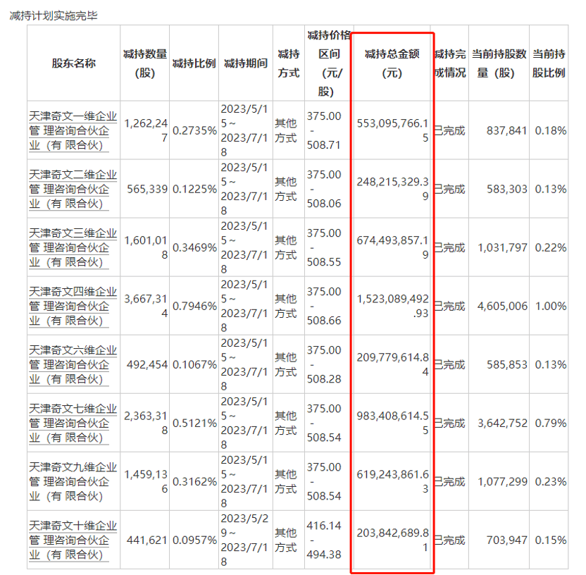 除奇文五维、奇文八维之外,奇文N维(指奇文一维至奇文十维共十家企业)合计减持套现50.15亿元。