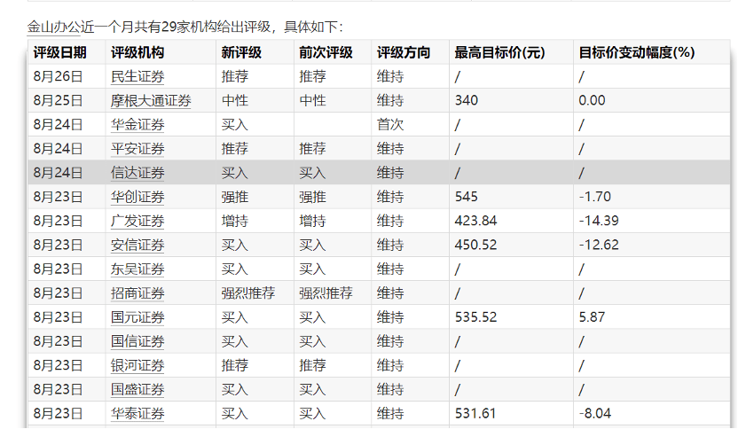 在金山办公业绩发布之后,摩根大通证券仅给出了“中性”的评级,不过华创证券、广发证券、安信证券等数家机构给予了推荐、买入、增持等评级,但其中至少有4家机构下调了股价最高目标值,下滑幅度在1%-15%之间。