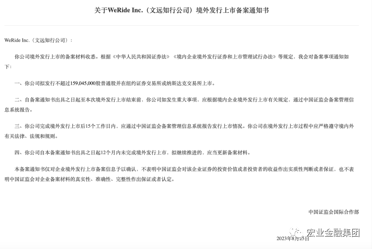 此外,证监会透露,自动驾驶技术公司文远知行正在寻求境外上市。这家由日产支持的公司计划在纽约证券交易所或纳斯达克交易所发行最多 1.59 亿股股票。