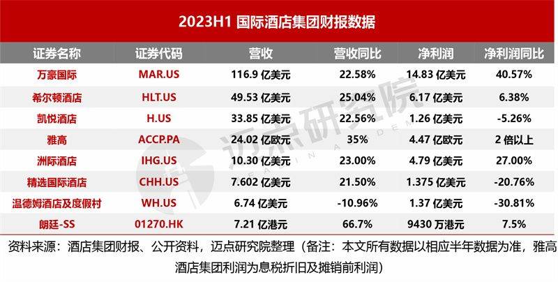 2023上半年,虽面临全球经济的不稳定性,但各大酒店集团的经营却表现出惊人的韧性:8家国际酒店集团中,除温德姆酒店及度假村外,其余7家营收均呈现同比正增长态势,同比增幅集中在20%-30%之间;净利润同比层面,凯悦酒店、精选国际酒店、温德姆酒店及度假村三家为负增长,且温德姆酒店及度假村下滑幅度最大,为-30.81%;综合相比之下,雅高集团的营收和净利润增幅表现最为突出,营收同比增长35%、净利润同比增长2倍以上,基于上半年的喜人业绩,雅高集团上调全年业绩增长预期至9.7亿欧元。