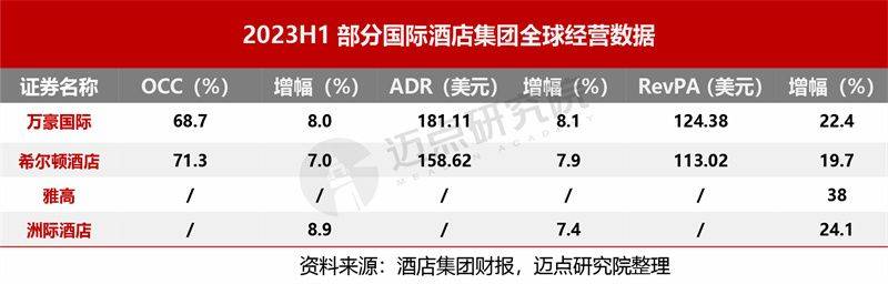 2023上半年,各主要国际酒店集团经营数据实现一定增幅,如万豪国际集团全球系统可比酒店的整体入住率达68.7%,同比增长8.0个百分点;平均房价181.11美元,同比增长8.1%;RevPAR124.38美元,同比增长22.4%。希尔顿酒店集团上半年的入住率高达71.3%,主要得益于休闲、商务旅行的复苏及其团体预订量的增长。