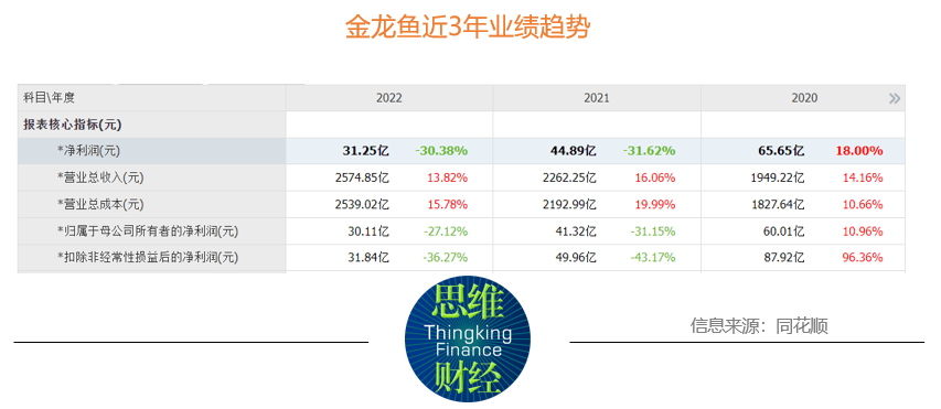 对于净利润大幅下滑的局面,金龙鱼在2022年年报中解释称,近两年受宏观环境以及农产品价格等因素影响,原材料成本涨幅较大,利润有所波动。