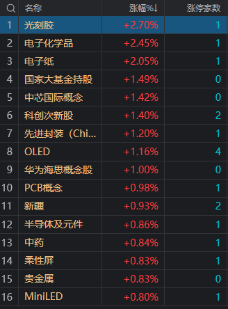 【午评:沪指缩量震荡跌0.53% 地产股集体调整】财联社8月31日电,市场早盘震荡调整,三大指数均小幅下跌。盘面上,光刻胶概念股震荡走强,容大感光涨超10%,格林达涨停。科创板次新股继续活跃,盛邦安全20CM3连板,康鹏科技、清越科技涨停。新疆本地股表现活跃,新疆交建、新赛股份涨停。下跌方面,地产股集体调整,天健集团、城建发展等多股跌超9%。总体上个股跌多涨少,两市超3400只个股下跌。沪深两市今日成交额5290亿,较上个交易日缩量1134亿。板块方面,光刻胶、科创板次新、PCB、新疆等板块涨幅居前,房地产、养殖、新型城镇化、教育等板块跌幅居前。截至收盘,沪指跌0.53%,深成指跌0.55%,创业板指跌0.54%。北向资金方面,沪股通早盘净流出16.62亿,深股通早盘净流出19.23亿。