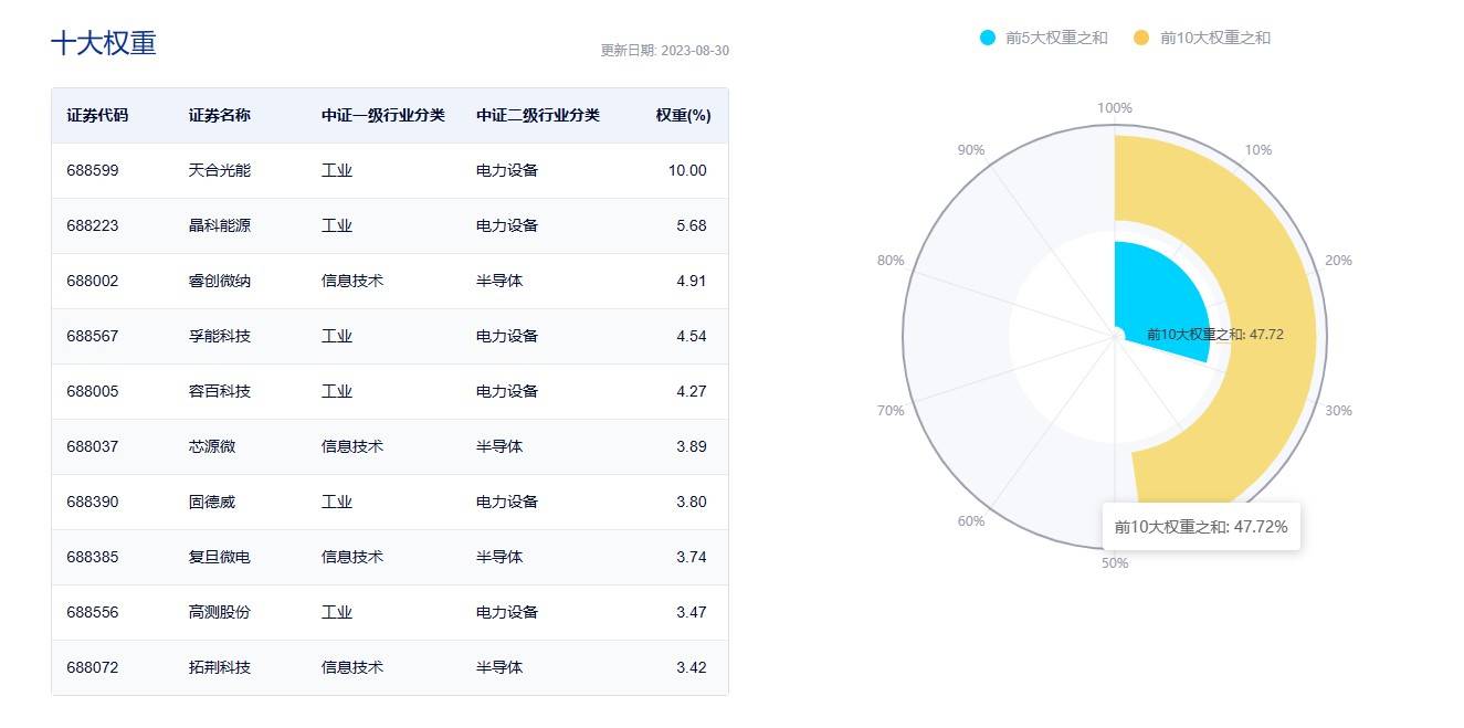 截至2023年8月30日,该指数前十大权重股包括天合光能、晶科能源、睿创微纳、孚能科技、容百科技等,前十大权重股占比合计约为47.72%。(数据来源:中证指数公司,指数成份股不代表个股推荐)