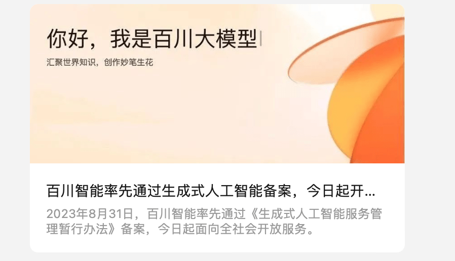 除了百度文心一言以外。王小川创办的百川智能也于8月31日对外宣布,已率先通过《生成式人工智能服务管理暂行办法》备案,今日起面向全社会开放服务,成为首批通过备案的8家公司之一。智谱华章的“智谱清言”今日也官宣上线。