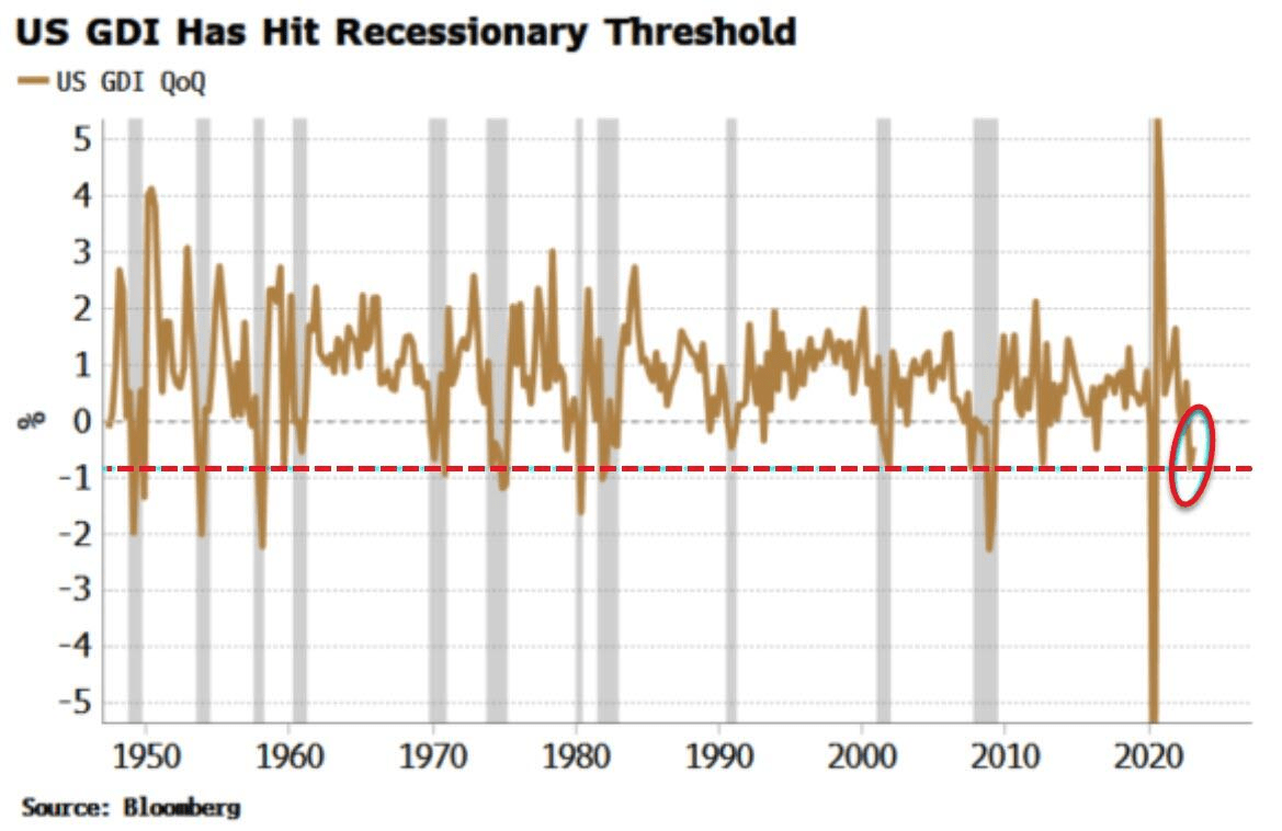 国内总收入(GDI)的趋势符合经济衰退。不过,GDP和GDI的差距达到了20多年来的最高水平。