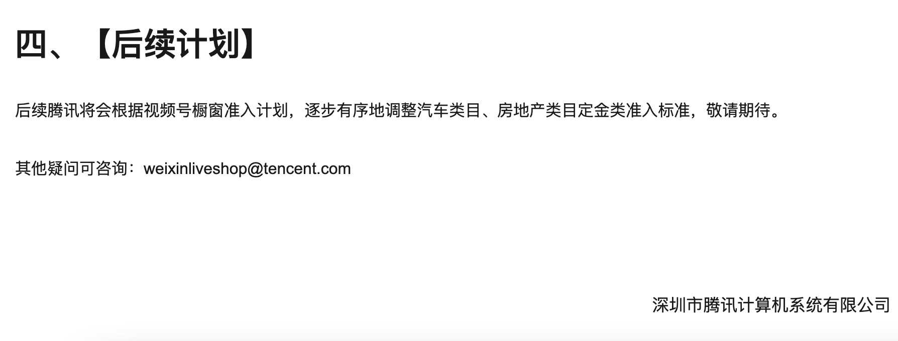 据官方称,后续将会根据视频号橱窗准入计划,逐步有序地调整汽车类目、房地产类目定金类准入标准。