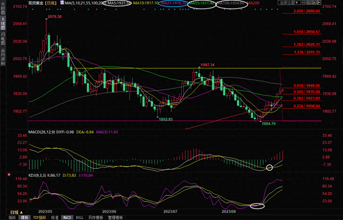 日线级别:震荡下跌后反弹;MACD金叉,KDJ金叉,金价顶破布林线中轨阻力后顶破55日均线,且初步站稳在55日均线上方,后市有望进一步试探100日均线1954.69附近阻力,甚至是布林线上轨1966.02附近,能否进一步上破布林线上轨还有待观察。