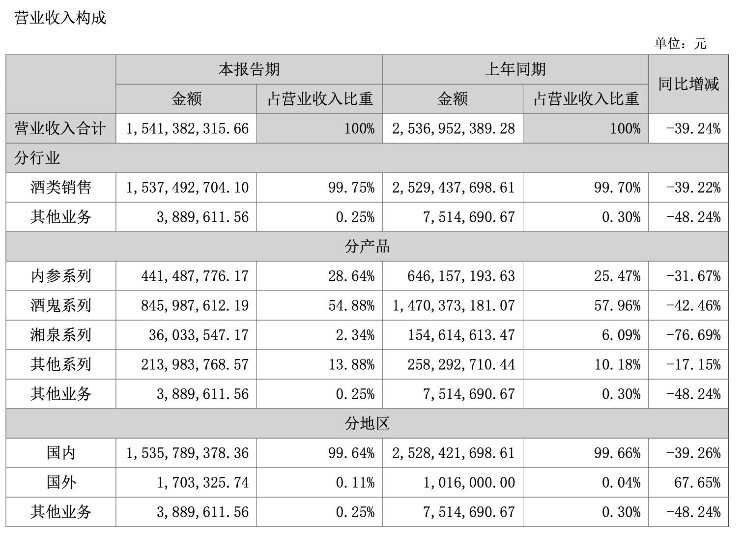酒鬼酒主要从事馥郁香型白酒系列产品的生产和销售,拥有“内参”“酒鬼”“湘泉”三大系列产品,今年上半年,这三大系列产品的营收占比分别为28.64%、54.88%、2.34%,分别为酒鬼酒贡献收入4.41亿元、8.46亿元、3603.35万元,下滑幅度分别为31.67%、42.46%、76.69%。