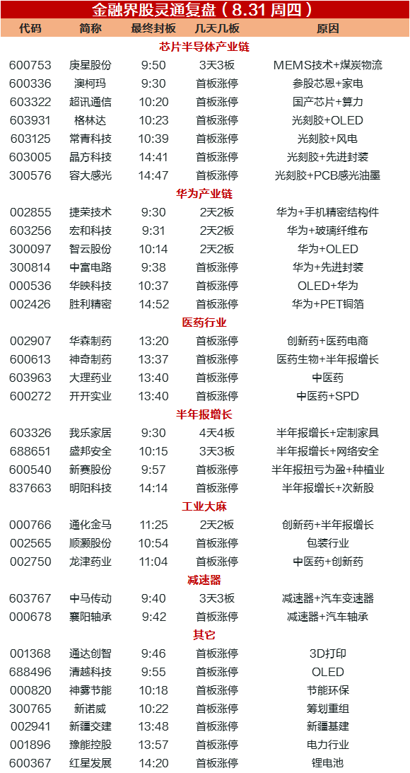8月31日周四,A股共32股涨停(不含ST股),9股封板未遂,连板股总数8只,我乐家居(业绩增长)4连板,庚星股份(国产芯片)、中马传动(汽车零部件)、盛邦安全(次新+华为)3连板,通化金马(中药+工业DM)、捷荣技术(华为概念)、智云股份(华为概念)、宏和科技(华为概念)2连板。