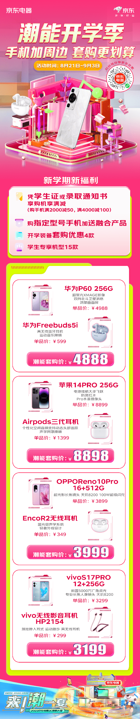 新学期新气象,还要新手机。9月3日前,凭学生证或录取通知书享购机享满减(购手机满2000减50,满4000减100),还加入了热门新款手机与融合产品的套购活动:玲珑四曲屏,超聚光XMAGE影像系统,双向北斗卫星消息的华为P60 256G搭配华为蓝牙耳机Freebuds5i,组合价4888元;超视网膜XDR显示屏,A16仿生芯片,灵动岛功能的苹果14PRO 256G 加上Airpods三代耳机,学生组合价只要8898元;配备了前置5000万广角柔光和专业长焦人像镜头的Vivo S17 PRO 12+256G加上vivo无线影音耳机HP2154,学生组合价3199元等等。