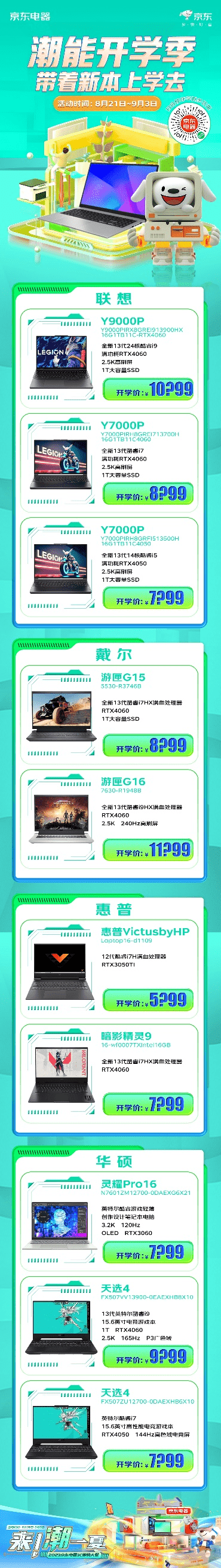 首先是笔记本,主要参考个人偏好,如果是上网、看电影、做作业等一般用途,可以选择那种12到14英寸屏幕,处理器中等性能,轻薄型的笔记本;如果喜欢玩游戏,或者是学设计、编程专业的同学,需要选择配备独立显卡,处理器性能较高,屏幕尺寸较大的笔记本。京东五星电器开学季活动中,像全新13代24核酷睿i9,满功耗高达RTX4060,2.5K高刷屏,1T大容量SSD的联想Y9000PIRX8GREI913900HX16G1TB11C-RTX4060开学价不到11000元;戴尔笔记本电脑游匣G15 5525-1766A开学价6000元不到,配备了R7处理器、RTX 3060,Ti追光显卡,野兽级性能:还有创作设计笔记本3.2K分辨率、120Hz刷新率的OLED屏,满功耗RTX3060的华硕灵耀Pro16N7601ZM12700-0DAEXG6X21 开学价8000元不到等等,都是学生首选的热门机型。
