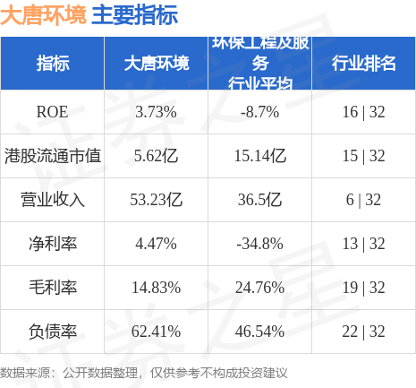 大唐环境港股市值5.62亿港元,在环保工程及服务行业中排名第15。主要指标见下表: