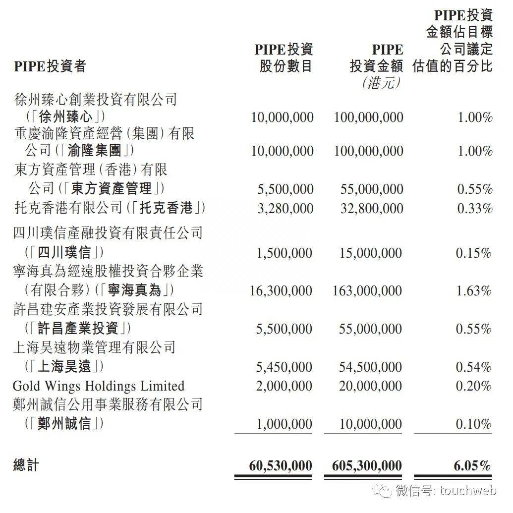 托克香港等全球大宗商品贸易商作为找钢网的战略投资人参与投资,徐州臻心、渝隆集团、东方资产管理、四川璞信、宁海真为、许昌产业投资、上海昊远、Gold Wings Holdings Limited及郑州诚信等财务投资人、大型国有投资人参与投资,合计对此次交易投入约6亿港元PIPE融资。