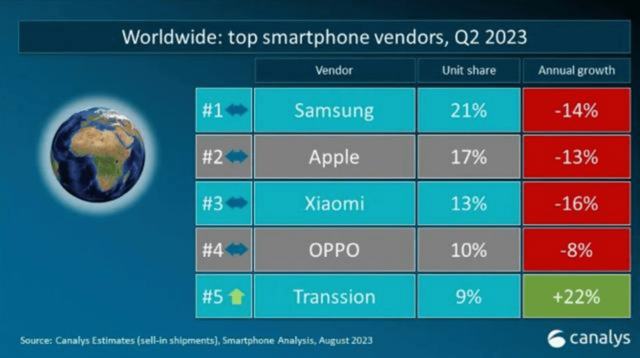 根据Canalys公布的2023年第二季度中国市场手机份额排名来看,小米在中国市场份额为13%,排在了第五;第一到第四分别是vivo、OPPO、苹果、荣耀。