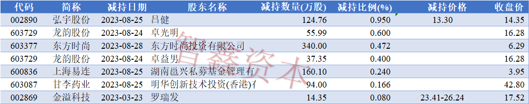 截至2023年8月31日17点,涉及股东减持的前五名上市公司分别为:东方时尚340.00万股、上海易联160.10万股、弘宇股份124.76万股、甘李药业94.00万股、龙韵股份93.34万股。