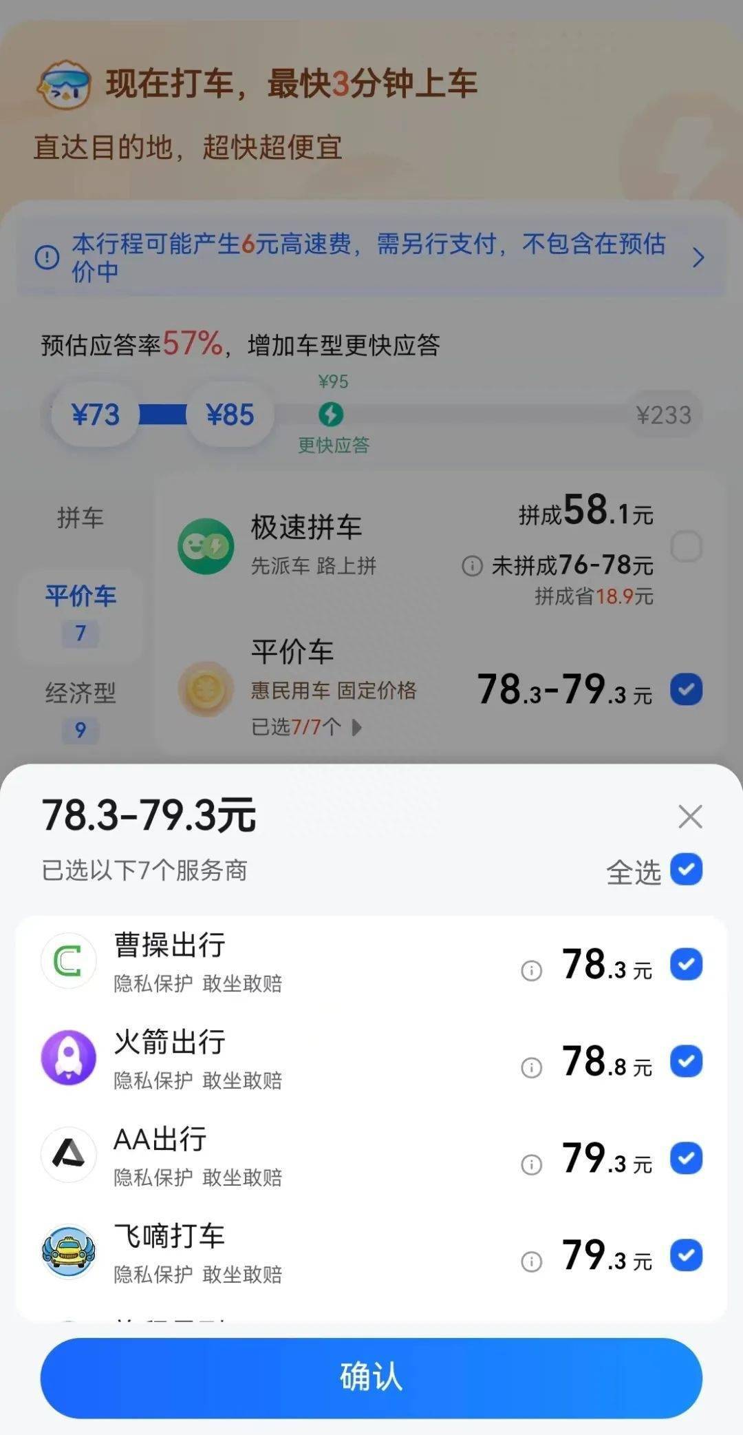 >>高德地图上的“平价车“页面,价格固定。