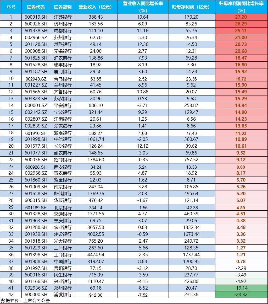 截至目前,42家上市银行中报业绩已悉数披露完毕,有37家上市银行实现归母净利润正增长,占比约88%;其中20家盈利增速达两位数,占比近半,增幅最高的江苏银行上半年实现净利润同比高增27.2%。