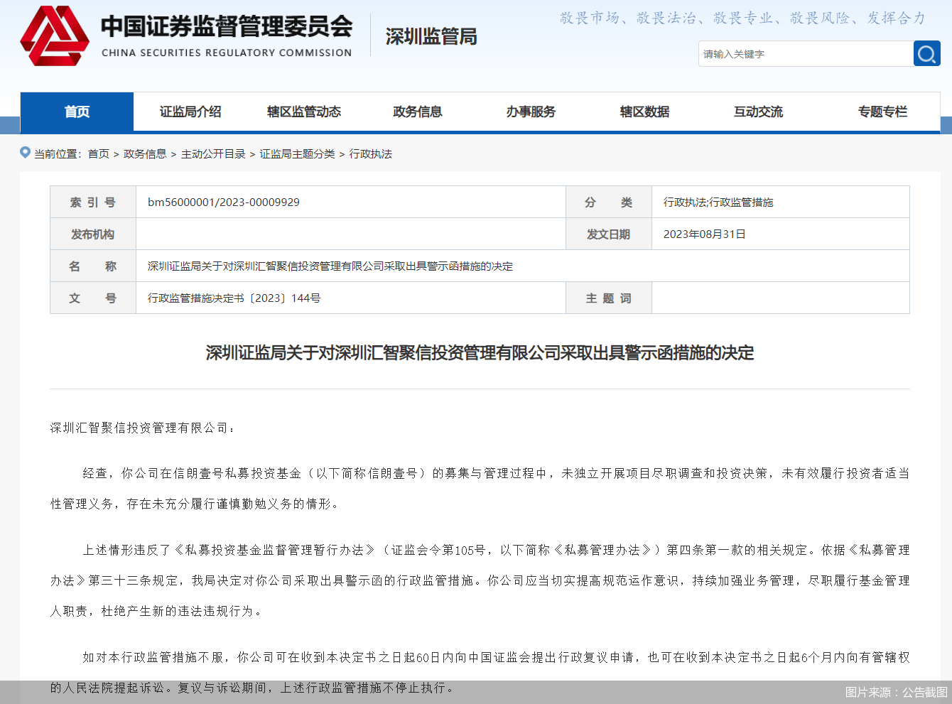 北京商报讯(记者 李海媛)8月31日,深圳证监局发布公告称,经查,发现深圳汇智聚信投资管理有限公司(以下简称“汇智聚信”)在信朗壹号私募投资基金(以下简称“信朗壹号”)的募集与管理过程中,未独立开展项目尽职调查和投资决策,未有效履行投资者适当性管理义务,存在未充分履行谨慎勤勉义务的情形。