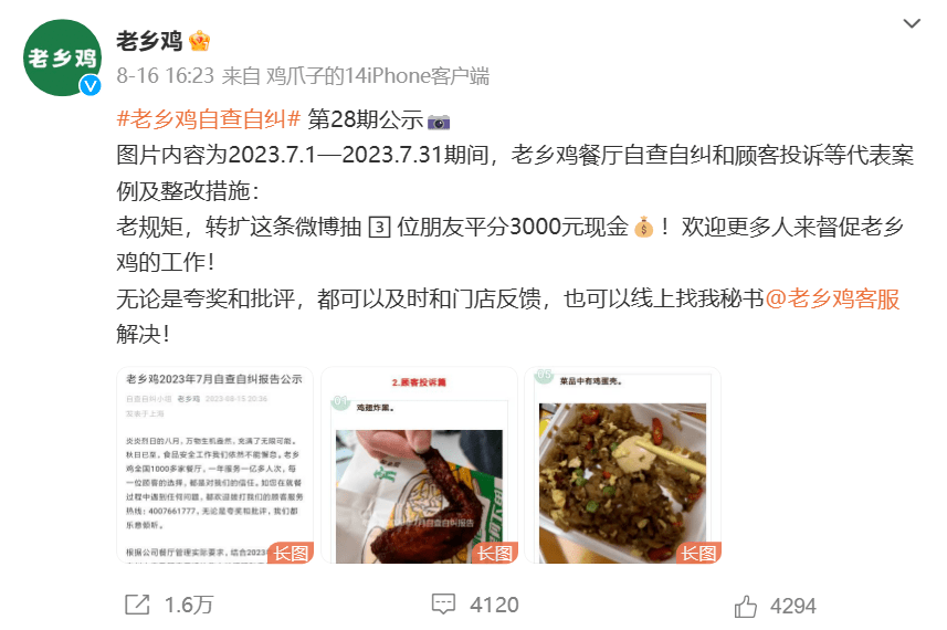 一个例子是,自2021年5月起,老乡鸡主动发布自查自纠工作报告,内容包括餐厅自查自纠、顾客投诉以及神秘顾客体验等方面。考核出现的问题老乡鸡也是从不回避,坚持以“自曝家丑”的形式激励门店做好品质和服务提升,不断改善顾客体验和满意度。
