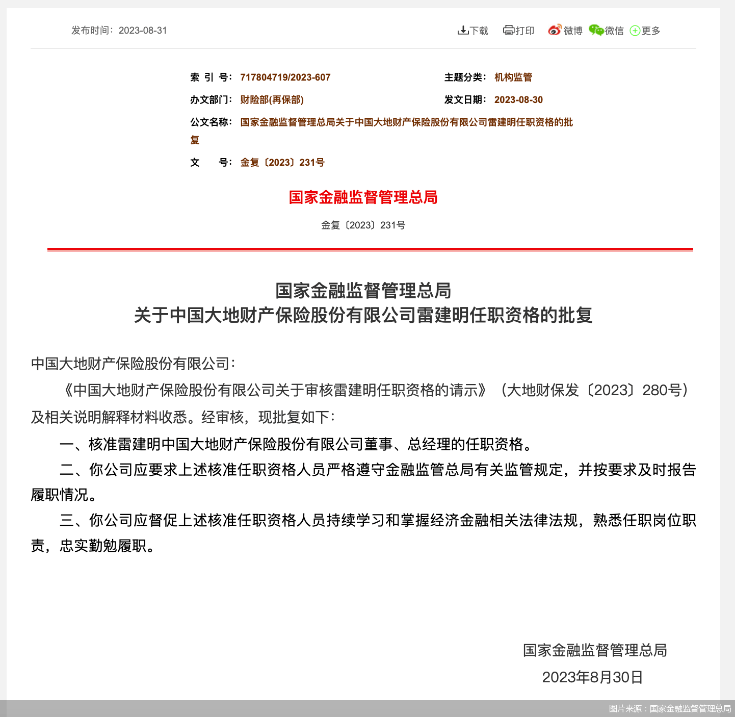 北京商报讯(记者 陈婷婷 胡永新)8月31日,国家金融监督管理总局发布关于中国大地财产保险股份有限公司(以下简称“大地保险”)雷建明任职资格的批复显示,核准雷建明大地保险董事、总经理的任职资格。
