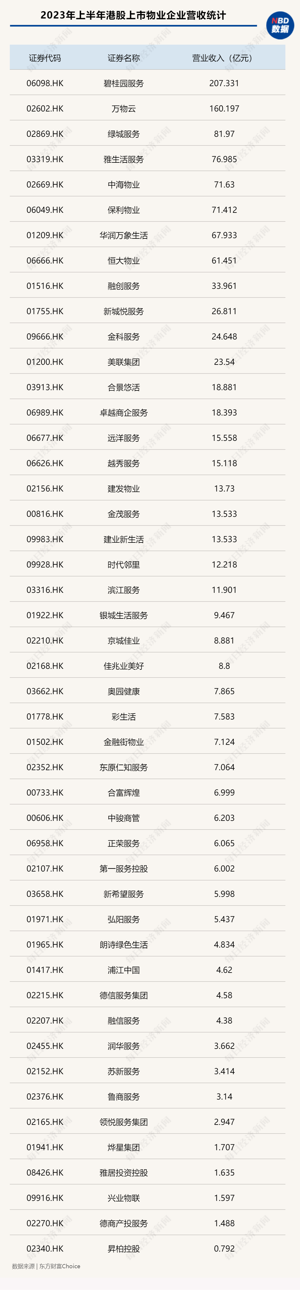 另据每经记者不完全统计,截至8月30日,已有52家A股和港股上市物企发布2023年中期业绩报告,其中碧桂园服务以207.33亿元遥遥领先,万物云则以160.2亿元位居第二。这也是上半年仅有的两家营收超百亿元的上市物企;此外,还有7家物企营收超50亿元。