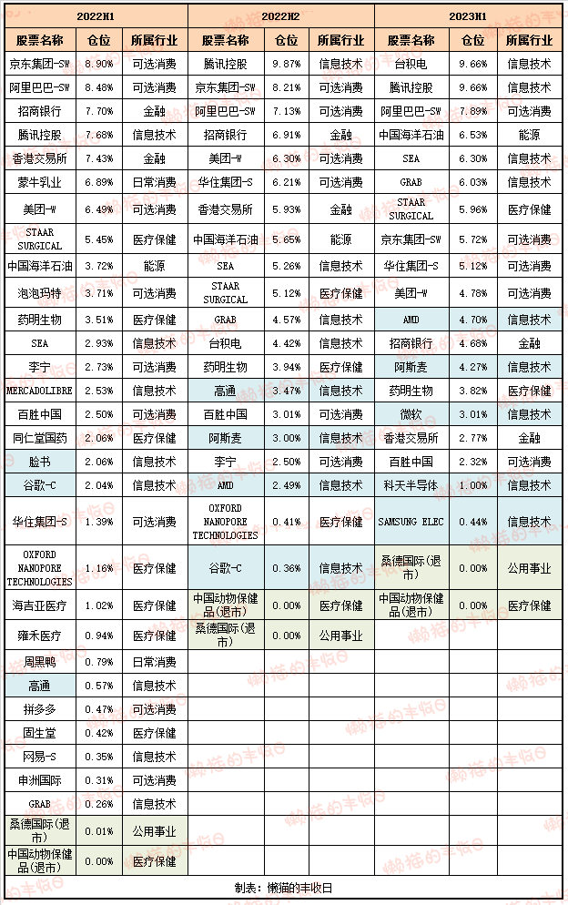 互联网方面,去年买过的脸书、谷歌被卖出,换成了微软。