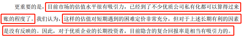 “目前市场的估值水平很有吸引力,已经到了不少优质公司私有化都可以算得过来账的程度了。