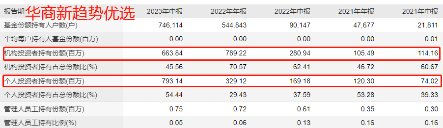 2022年上半年,机构开始加仓周海栋,基本按照半年翻一番的节奏,年底持有份额从1.05亿份增加到了7.89亿份,然后在今年上半年赎回到只剩6.64亿份。