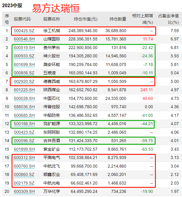 易方达瑞恒减持了之前重仓的白酒、煤炭,买了机械(徐工机械)、汽车电子(德赛西威)、军工(中航沈飞、中航光电)、中药(东阿阿胶)。