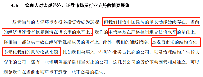 但他认为短期风险也不能忽视,他采取了两个策略:主策略是严控组合的估值水平,然后寻找机会;辅助策略是观察市场结构变化,多元化风险收益来源,比如买海外业务占比高的公司、治理结构发生较大变化的公司,这些公司股价驱动因素相对独立,可以避免一些不必要的损失。