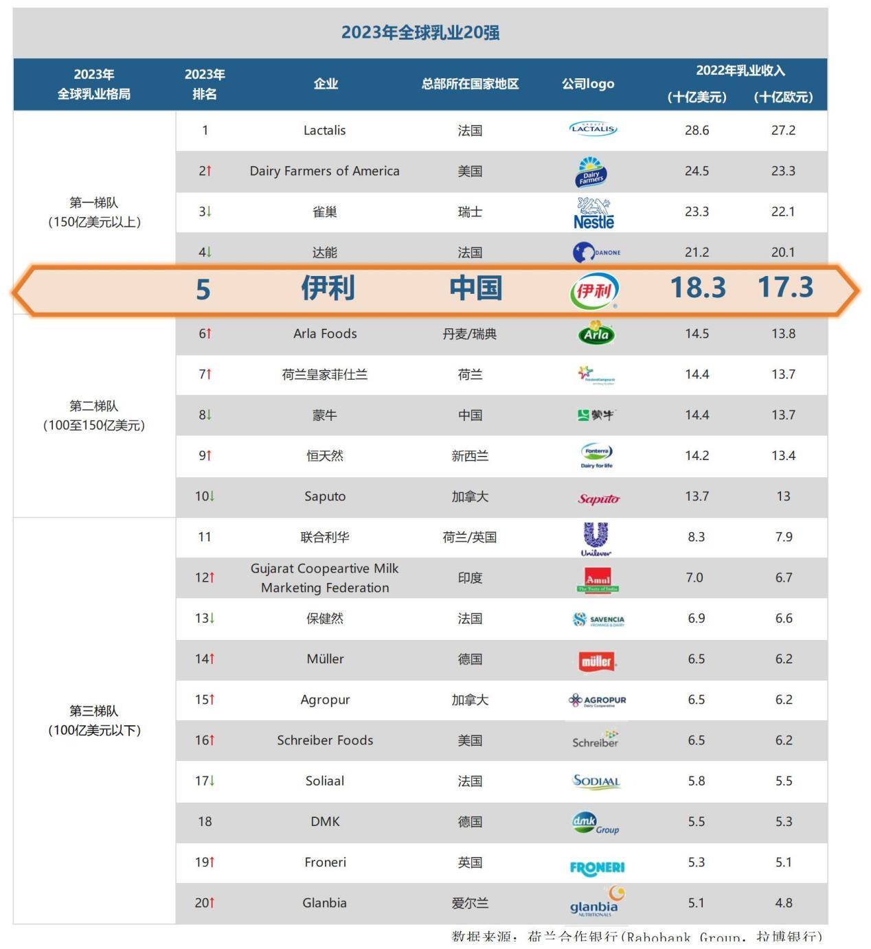 1. 稳居全球乳业第一梯队,是国内外公认的行业绝对领导者。伊利是疫情期间唯一实现营收、净利双增长的综合型规模乳企,也是唯一稳居全球前列的本土企业。29日荷兰合作银行最新发布的2023年全球乳业20强排名显示,伊利连续第4年登上全球乳业五强榜单,再次成为唯一位列全球五强的中国乳企。