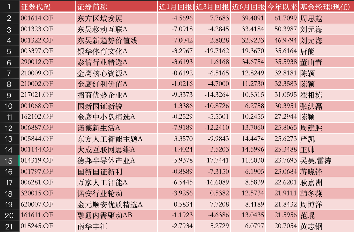 再看混合型基金的“牛基”TOP20榜,和7月末相比,其实榜单排名变化不大,排名第一的依然是上个月突然冲上来的东方区域发展。截至8月31日,其年内回报61.71%。
