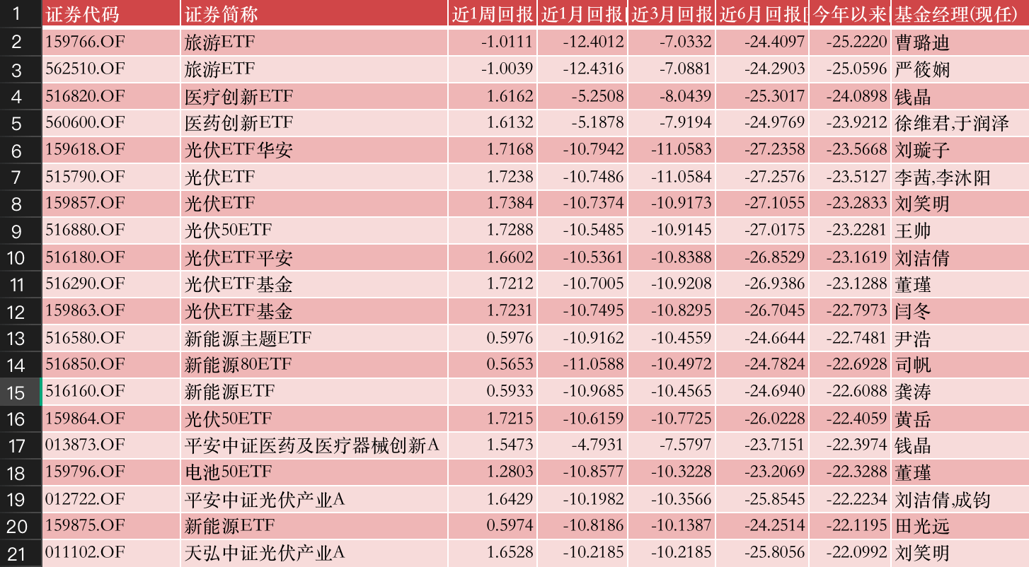 最后是指数型弱基TOP20榜,“队列”很整齐,排名前两位的都是旅游ETF,跌幅超过25%。接下来是两只医疗创新ETF,跌幅23%。