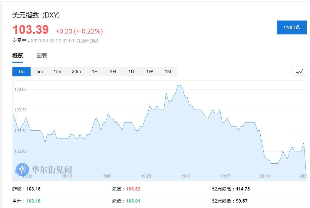 数据发布后,美元指数短线走低约10点,现报103.41。