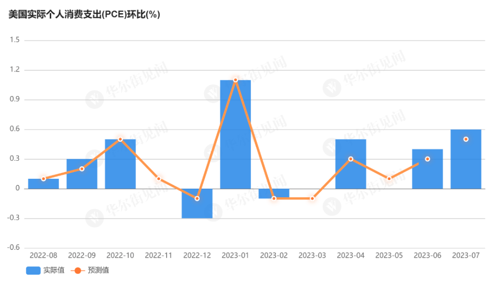 7月份个人消费支出(PCE)环比强劲增长0.8%,超过预期的0.7%,6月数据上修至0.6%。