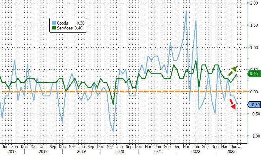 7月份服务业通胀环比增长0.4%,为年初以来最大环比涨幅;而商品通胀环比下降0.3%,为自2022年以来最大的环比下降。