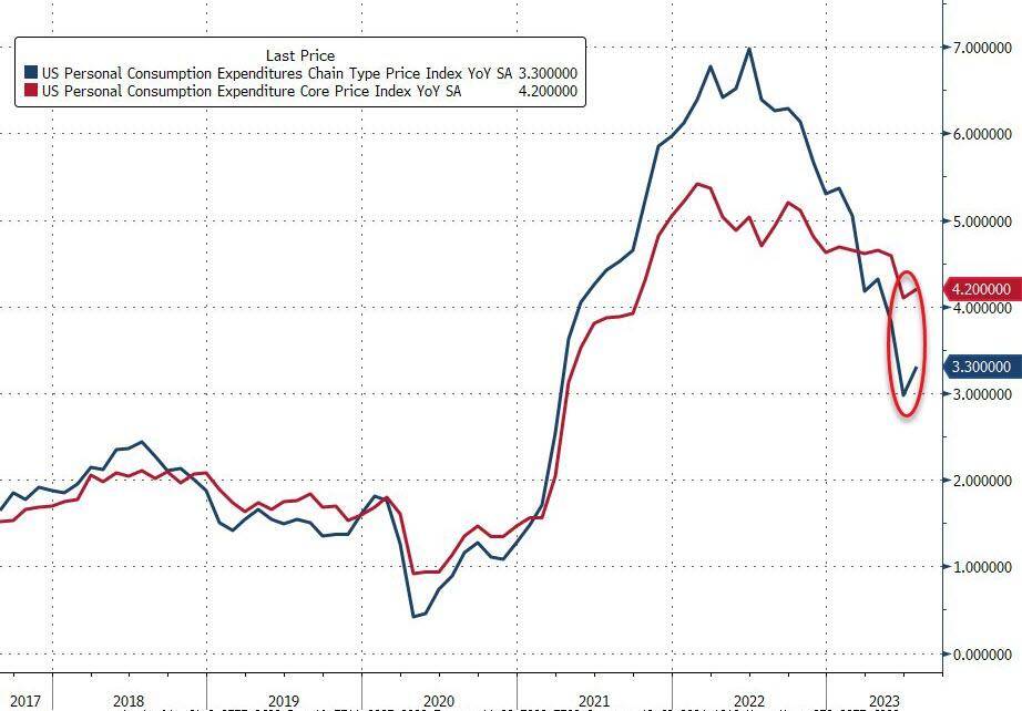 8月31日周四,美国商务部最新数据显示,美国7月PCE(个人消费支出)物价指数同比从6月的3%反弹至3.3%,符合市场预期,创2022年6月以来最大同比增幅;环比增长0.2%,与预期和前值持平。