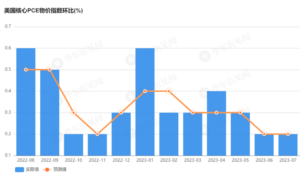 美联储最爱通胀指标——剔除食物和能源后的核心PCE物价指数同比增速从6月的4.1%略上升至4.2%,符合市场预期;环比增长0.2%,也与预期和前值持平,这是核心PCE物价指数连续第二个月环比增长0.2%——符合通胀逐步降温的趋势,原因是要实现2%的通胀目标,通胀月环比应为0.2%(部分月份应为0.1%)。